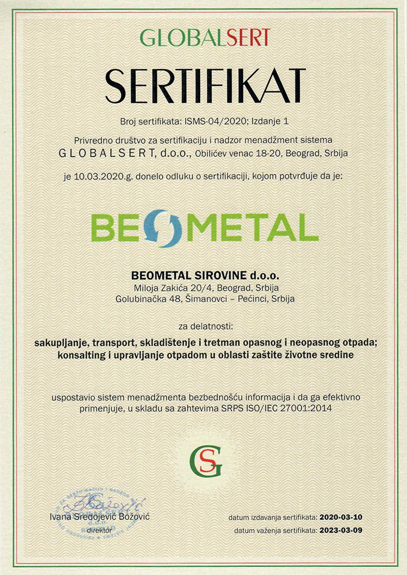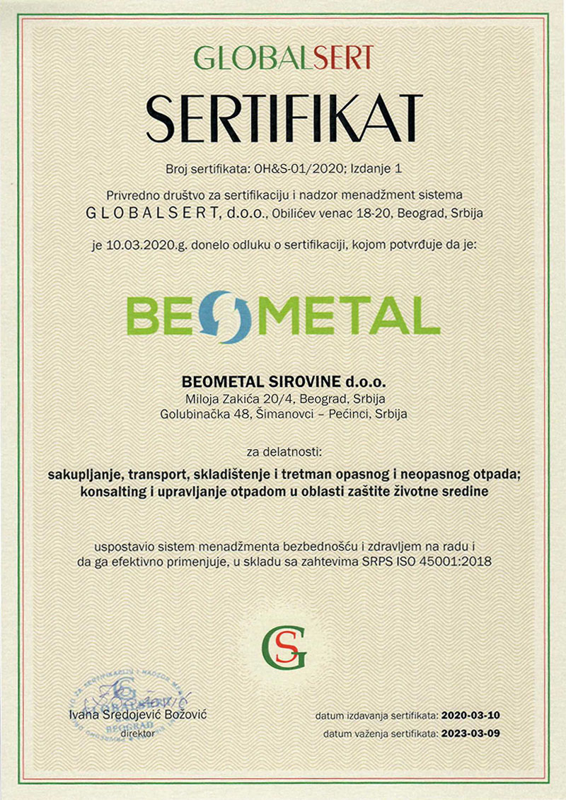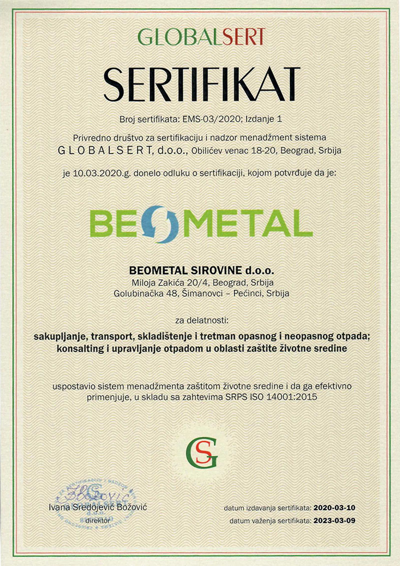 Licencirani smo od strane nadležnog Ministarstva ekologije Republike Srbije i posedujemo integralne dozvole za sakupljanje i transport neopasnog i opasnog otpada koje važe na teritoriji Republike Srbije kao i dozvole za skladištenje i tretman izdate od nadležnih organa.